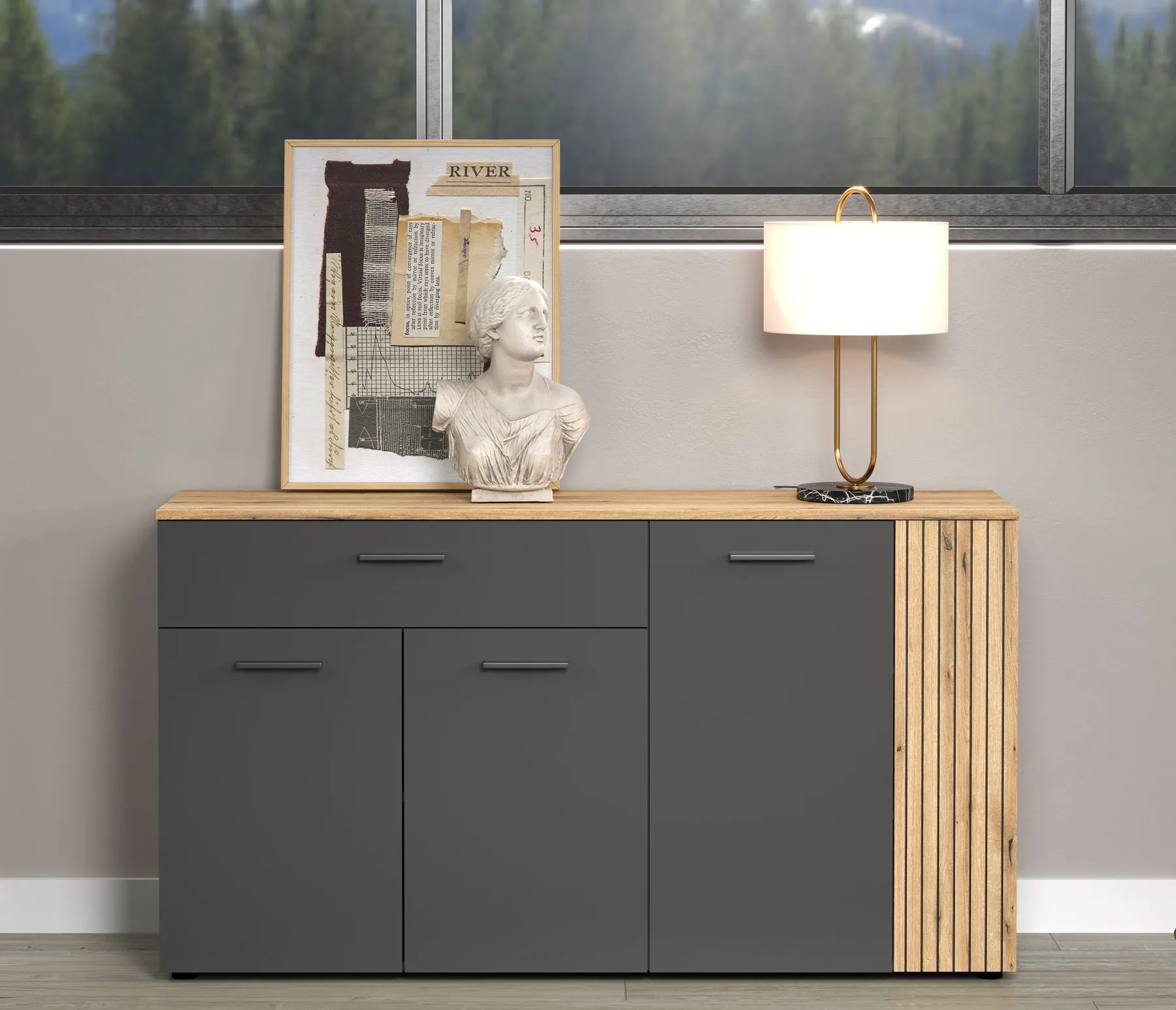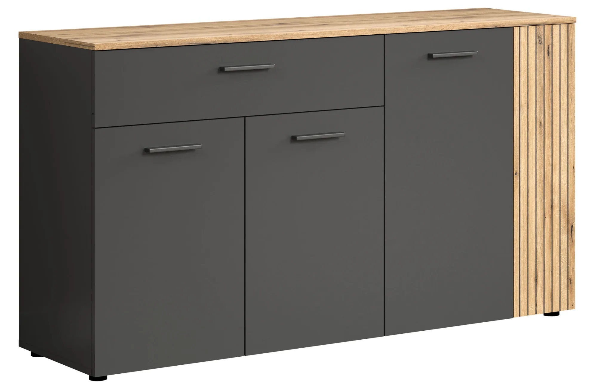 • Ryflowany panel w odcieniu dąb evok podkreśla unikalny styl komody.