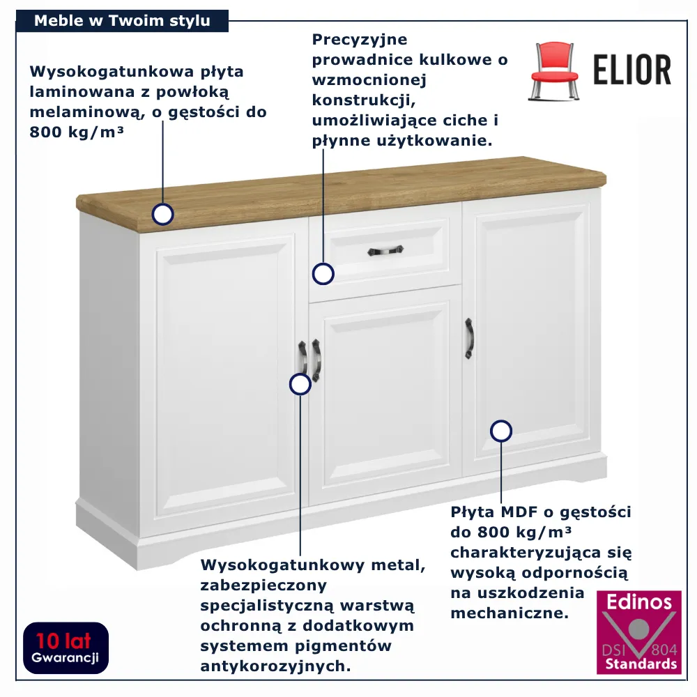 • Produkt posiada certyfikat jakości "Edinos Standards DSI 804", który potwierdza najwyższą jakość wykonania mebla oraz pełny stopień zgodności poszczególnych jednostek wytworzonego wyrobu z przyjętym wzorcem.
