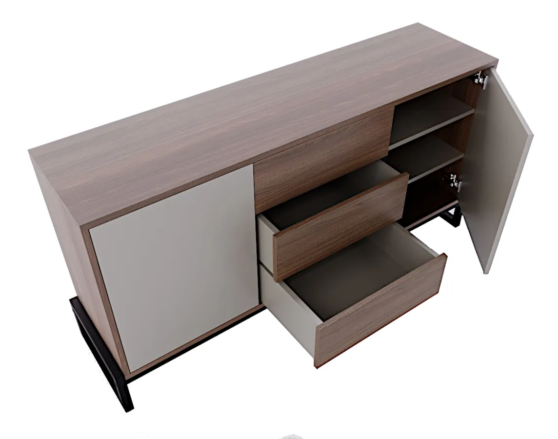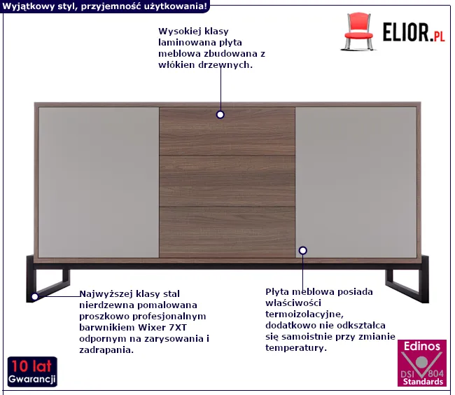 Rewelacyjnie wykonana komoda Sabul 8X marki Edinos Premium to synonim innowacyjności w projektowaniu mebli z wysokogatunkowych i starannie dobranych surowców. Przy produkcji mebla skorzystano z najlepszych materiałów, które gwarantują jakość na wiele lat. Nogi komody zostały wykonane z najwyższej jakości stali nierdzewnej pomalowanej proszkowo odpornym na zarysowania i zadrapania. Technika malowania proszkowego charakteryzuje się dużą trwałością, odpornością na korozję, chemikalia, wysoką temperaturę oraz uszkodzenia mechaniczne co gwarantuje Ci niezwykły wygląd mebla na wiele lat. Szkielet mebla stanowi laminowana płyta meblowa o podwyższonej trwałości i gęstości. Płyta ta powstała z włókien drzewnych i związków organicznych w warunkach wysokiego ciśnienia i temperatury. Włókna ułożone są różnokierunkowo, o strukturze sinusoidalnej, co zapewnia nadanie jej cech jakościowych oraz wytrzymałościowych. Dodatkowo płyta została uszlachetniona cienkimi filmami melaminowymi w celu zwiększenia jej trwałości. Brzegi mebla oklejono specjalistycznym materiałem ABS, cechującym się ponadprzeciętną odpornością na zarysowania i uszkodzenia mechaniczne. Posiada właściwości termoizolacyjne, dodatkowo nie odkształca się samoistnie przy zmianie