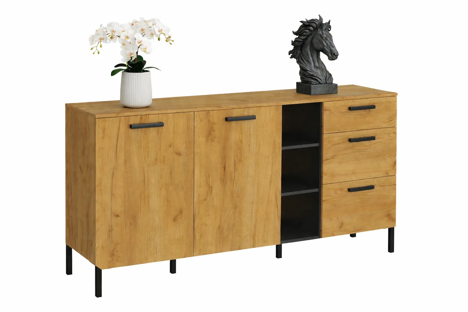 Komoda Vinos 4X to jeden z elementów z kolekcji Opes. Połączenie funkcjonalności i stylu, które idealnie uzupełnią Twoje wnętrze. Z czterema półkami ukrytymi za eleganckimi frontami oraz trzema praktycznymi szufladami, komoda zapewni nie tylko mnóstwo miejsca do przechowywania, ale także estetyczne podkreślenie nowoczesnego charakteru Twojego wnętrza. Dzięki trzem dodatkowym półkom otwartym, możesz wyeksponować swoje ulubione dekoracje lub elementy codziennego użytku. Funkcjonalność i elegancja w jednym meblu!