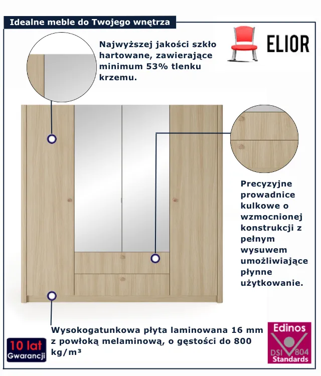 • Produkt posiada certyfikat jakości "Edinos Standards DSI 804", który potwierdza najwyższą jakość wykonania mebla oraz pełny stopień zgodności poszczególnych jednostek wytworzonego wyrobu z przyjętym wzorcem.