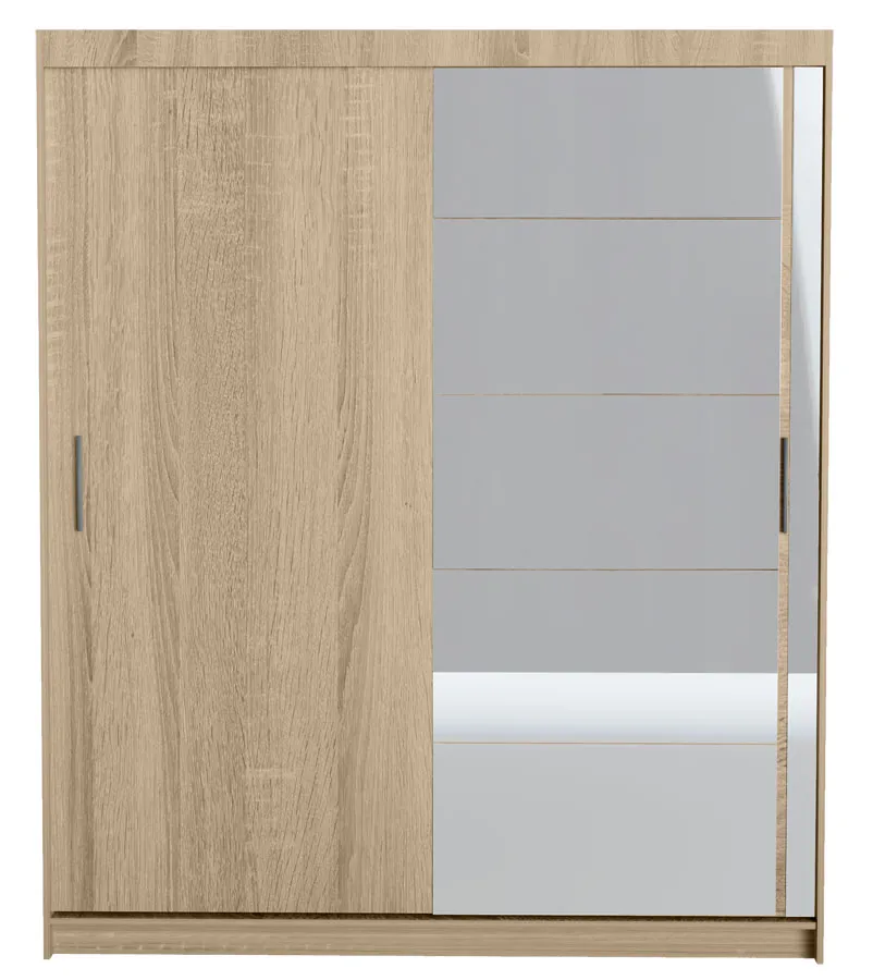 Szafa to mebel z którego korzystamy każdego dnia, dlatego powinna wyróżniać się ponadprzeciętną jakością. Ponieważ wiemy, jak wiele dostępnych dziś produktów nie spełnia oczekiwań konsumentów, dołożyliśmy wszelkich starań, aby zapewnić Ci maksymalny komfort podczas użytkowania tego mebla. Szafa z drzwiami przesuwnymi Volvero 3X w kolorze dąb sonoma została skonstruowana z najwyższej jakości laminowanej płyty meblowej o grubości 16 mm o klasie higieny E1. Dodatkowo uszlachetniono ją cienkimi filmami melaminowymi, by zwiększyć jej trwałość. Płyta posiada specjalistyczne włókna ułożone różnokierunkowo o strukturze sinusoidalnej, co zapewnia nadanie jej cech jakościowych oraz wytrzymałościowych. Wnętrze szafy zostało zorganizowane w przemyślany sposób: zawiera ona 6 pojemnych półek na ubrania, większe gabarytowo przedmioty, walizki, zapasową pościel czy ubrania sezonowe oraz przestronną część z drążkiem, przeznaczonym do przechowywania odzieży wierzchniej, garniturów i ubrań wizytowych. Stwórz wymarzoną aranżację wyróżniającą doskonałą harmonią, którą osiągniesz dzięki szafie Volvero 3X!