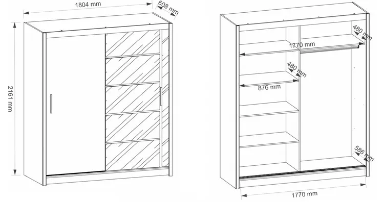 • Wymiary całkowite: szerokość: 180 cm, głębokość: 61 cm, wysokość: 216 cm.