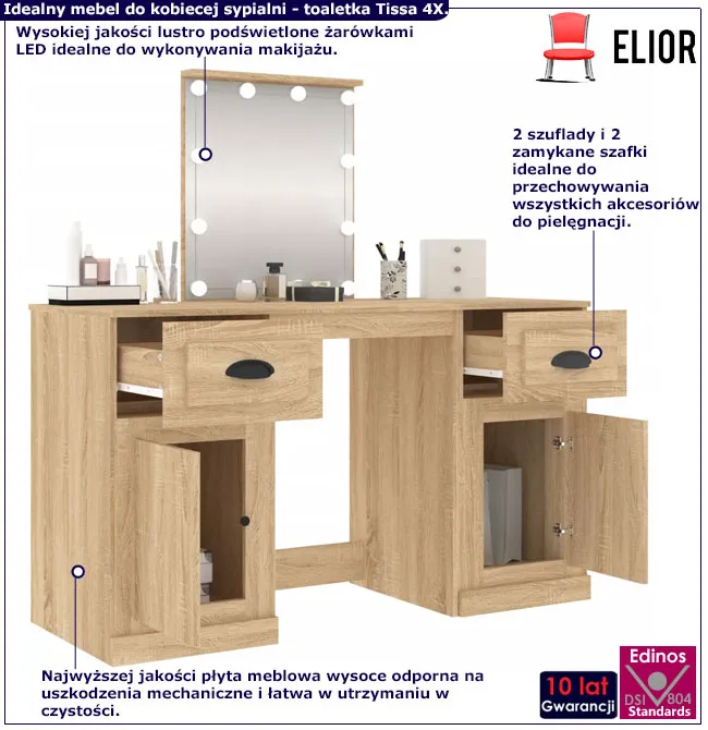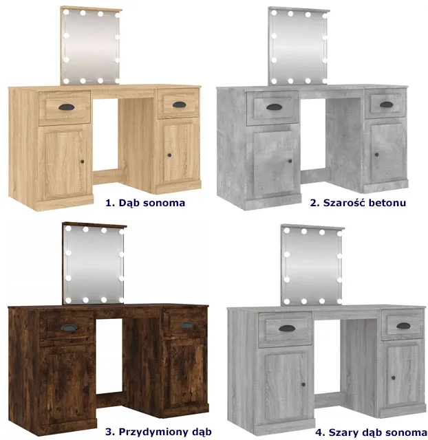 • Kolor: dąb sonoma. W naszej ofercie posiadamy także inne toaletki z lampkami.