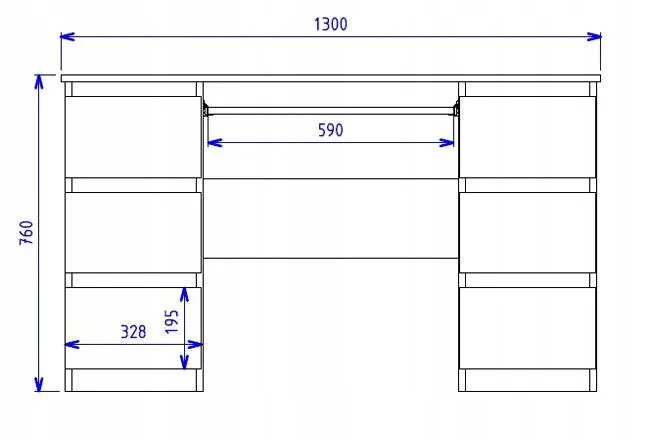 - Wymiary: długość: 130 cm, szerokość: 51 cm, wysokość: 76 cm, szerokość przestrzeni na nogi: 59 cm, wymiary szuflady: 32,8x19,5 cm.