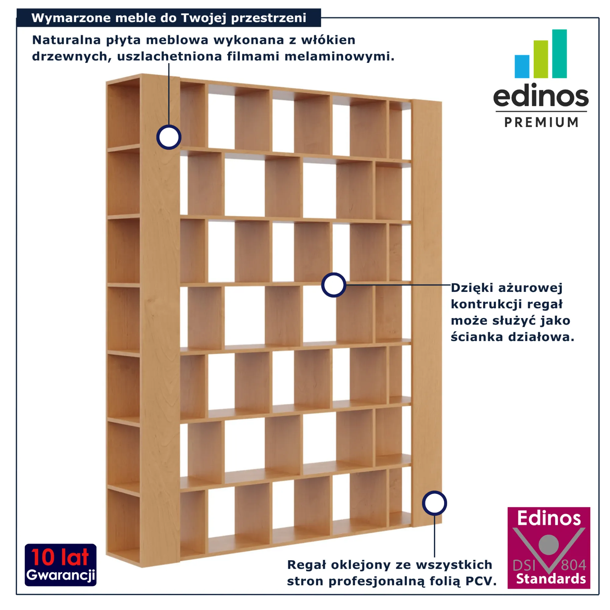 • Okleina PCV – zabezpiecza powierzchnię przed uszkodzeniami, wilgocią i zarysowaniami, dzięki czemu regał zachowuje estetyczny wygląd przez długi czas.