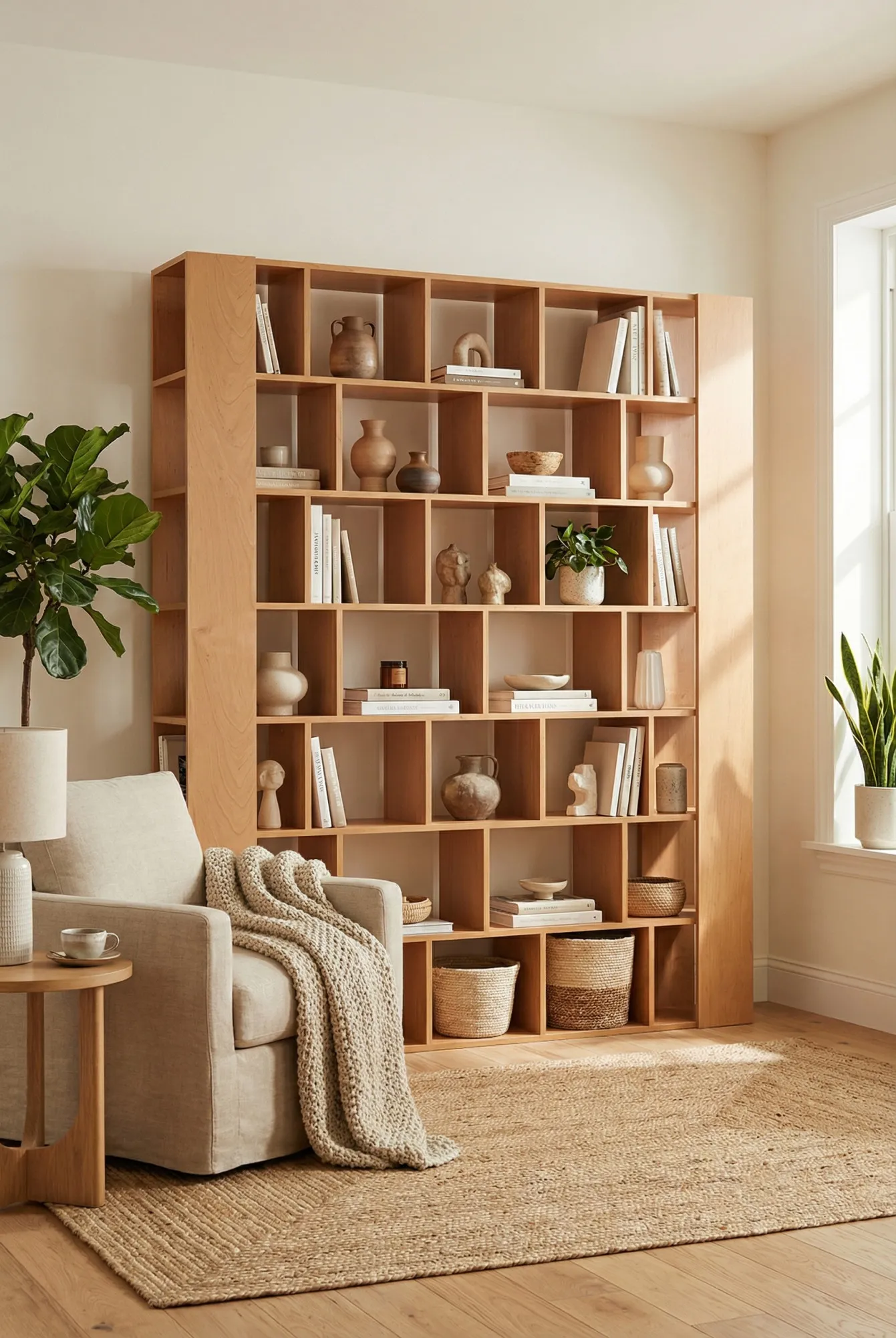 Wnętrze z wykorzystaniem regału olcha Naseri jako ścianki działowej