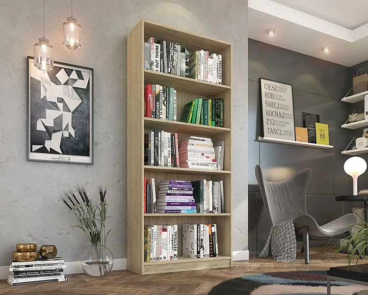 - Kolor: Dąb Sonoma, tylna ścianka regału w kolorze białym.
