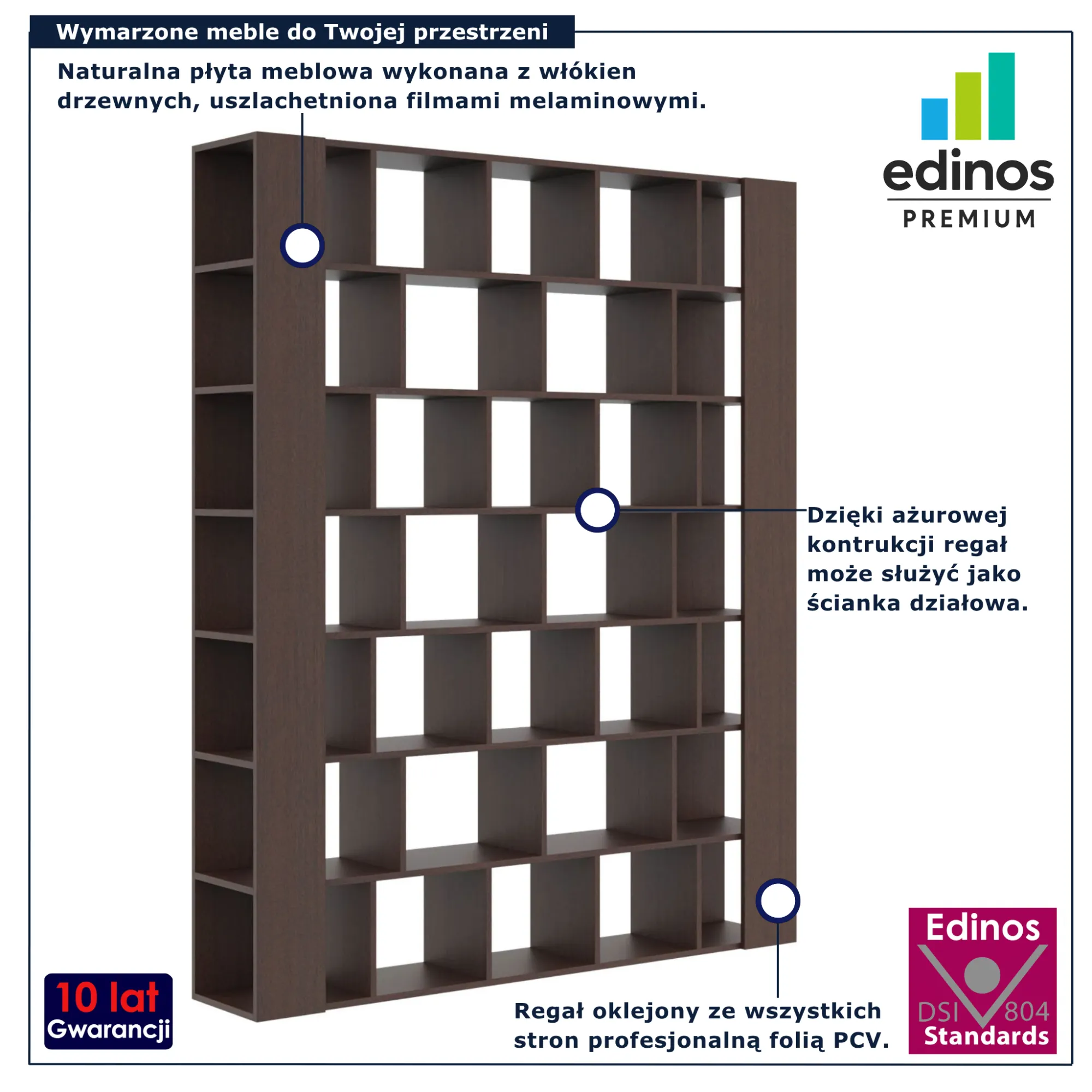 • Produkt posiada certyfikat jakości "Edinos Standards DSI 804", który potwierdza najwyższą jakość wykonania mebla oraz pełny stopień zgodności poszczególnych jednostek wytworzonego wyrobu z przyjętym wzorcem.