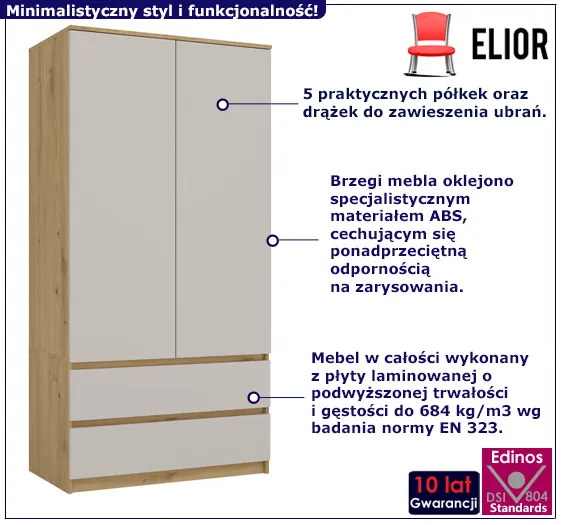 Szafa w ciepłym i modnym kolorze dąb artisan wykonana została z laminowanej płyty meblowej grubości 16 mm o klasie higieny E1, uszlachetnionej cienkimi filmami melaminowymi. Posiada także specjalne włókna ułożone różnokierunkowo o strukturze sinusoidalnej, co zapewnia nadanie jej cech jakościowych oraz wytrzymałościowych. Dla zwiększenia wytrzymałości i trwałości mebla, obrzeża komody wykończono odpornym na uszkodzenia mechaniczne tworzywem ABS. Szuflady na prowadnicach rolkowych są gwarancją wygodnego i przede wszystkim bezpiecznego użytkowania. Bezuchwytowe fronty podkreślają nowoczesny i modernistyczny styl mebla. Dwie pojemne szuflady są wyjątkowo praktyczne i zapewniają komfortowe przechowywanie nie tylko odzieży czy dodatków. Ukryte za drzwiami 4 półki oraz drążek na ubrania wierzchnie umożliwiają Ci funkcjonalne posegregowanie garderoby i jej estetyczny wygląd. Półki, w zależności od Twych preferencji, możesz zamontować z prawej lub lewej strony. Szafę wyposażono w praktyczny system Tip-On - drzwi mebla otwierane są po delikatnym naciśnięciu frontu. Stonowana kolorystyka i prosta forma sprawiają, że szafa Ollos doskonale odnajduje się we wnętrzach mieszkalnych i usługowych urządzonych w stylu skandynawskim, jak też minimalistycznym czy nowoczesnym. Świetnie sprawdza się także we wnętrzach dziecięcych czy młodzieżowych. Stwórz w swoim domu niepowtarzalny i ciepły klimat z szafą marki Elior!