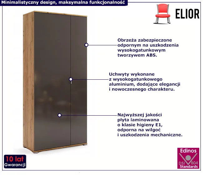 • Produkt posiada certyfikat jakości "Edinos Standards DSI 804", który potwierdza najwyższą jakość wykonania mebla oraz pełny stopień zgodności poszczególnych jednostek wytworzonego wyrobu z przyjętym wzorcem.
