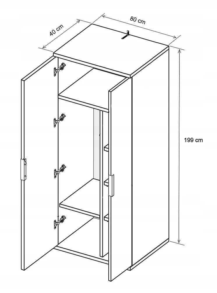 • wysokość 199 cm, szerokość 80 cm, głębokość 40 cm