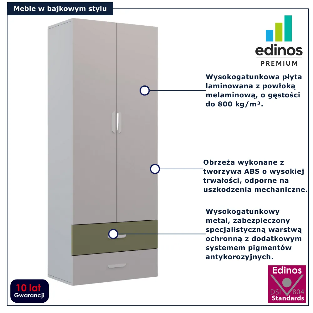 Szafa dziecięca dwudrzwiowa z 2 szufladami Zimi 3X marki Edinos Premium to niezawodny wybór, który pomoże wprowadzić porządek i styl do dziecięcego świata. To solidny mebel stworzony z myślą o bezpieczeństwie i komforcie Twojego dziecka, dostępny w atrakcyjnej cenie 1158 zł. Wybierz funkcjonalność, która rozwija się razem z Twoim dzieckiem – zamów już dziś!