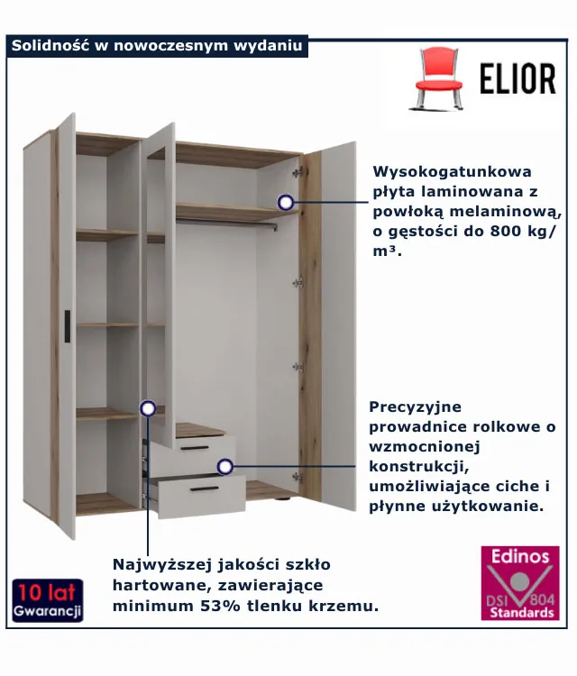 Dilsox marki Edinos Premium to coś więcej niż zwykła szafa – to przemyślany system codziennej wygody, który zaczyna się już od pierwszych minut dnia. Dzięki niej poranki stają się spokojniejsze, a stylizacja – szybsza i przyjemniejsza. Wybierz elegancję, porządek i funkcjonalność, które każdego dnia będą pracować na Twój komfort już teraz w rewelacyjnej cenie 1788 zł.