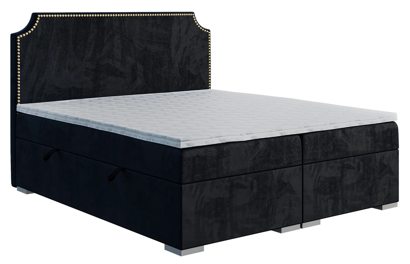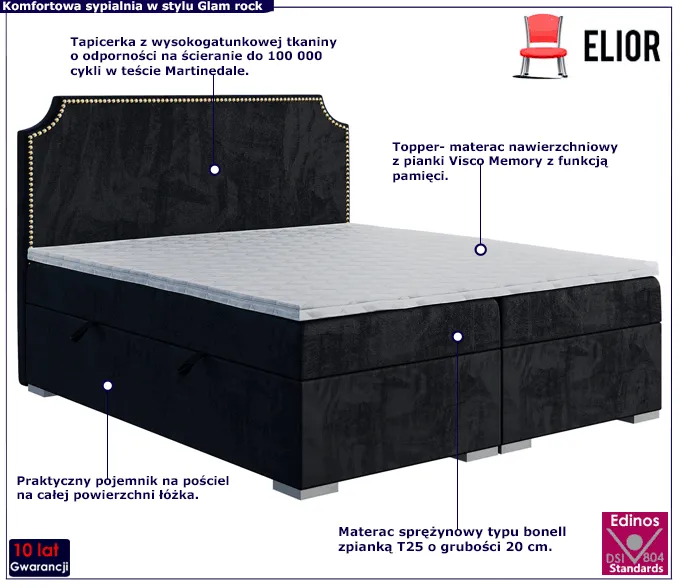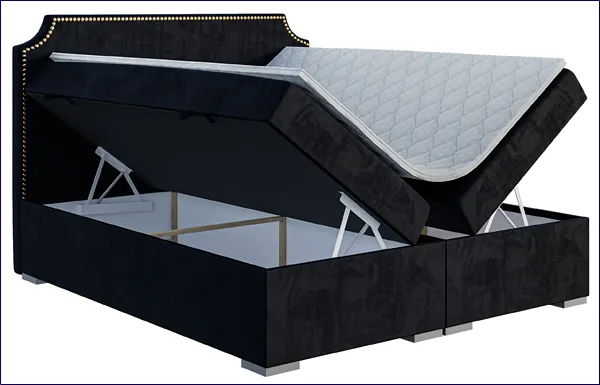 - Łóżko wyposażone jest w pojemnik na pościel, wysokiej jakości materac bazowy typu bonell z pianką T 25 o grubości 20 cm i Topper z pianki Visco Memory o grubości 5 cm.