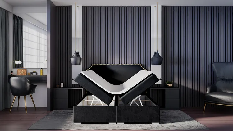 Łóżko Afre posiada praktyczny pojemnik na pościel dla utrzymania ładu w sypialni, z automatami ułatwiającymi otwieranie.