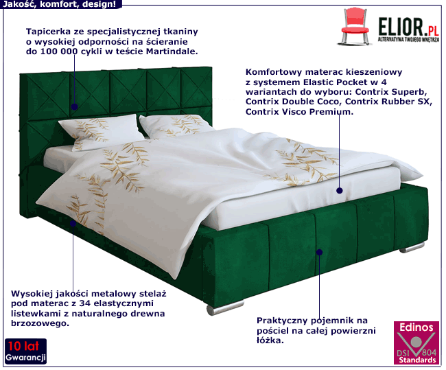 Odpowiednio dobrany do naszych potrzeb materac to podstawowy warunek zdrowego snu i komfortowego wypoczynku. Ponieważ dobór materaca jest kwestią bardzo indywidualną, marka Elior zaprojektowała aż cztery komfortowe materace, dedykowane do tapicerowanego łóżka Lehdes 3X. Wszystkie 4 modele zostały wyposażone w system kieszeni Elastic Pocket ze strefami o zróżnicowanej twardości zapewniającymi ergonomiczną pozycję ciała. Każda sprężyna jest w osobnej otulinie z wyjątkowo elastycznego materiału, który zapobiega przecieraniu się i pękaniu kieszonek, eliminując przy tym efekt wyginania się kieszeni i dodatkowo zwiększając wytrzymałość. Sprężyny zostały wykonane w najnowocześniejszej technologii CONTROLHARD, wykorzystującej podwójne hartowanie drutu węglowego, które zapewnia ponad 50% wydłużoną żywotność. Dodatkowo każdy materac został wyposażony w pikowany pokrowiec antyalergiczny o wydłużonym cyklu ścieralności z wszytym zamkiem, który dzięki możliwości zdjęcia i wyprania pozwala zachować świeżość i najwyższy poziom higieny.