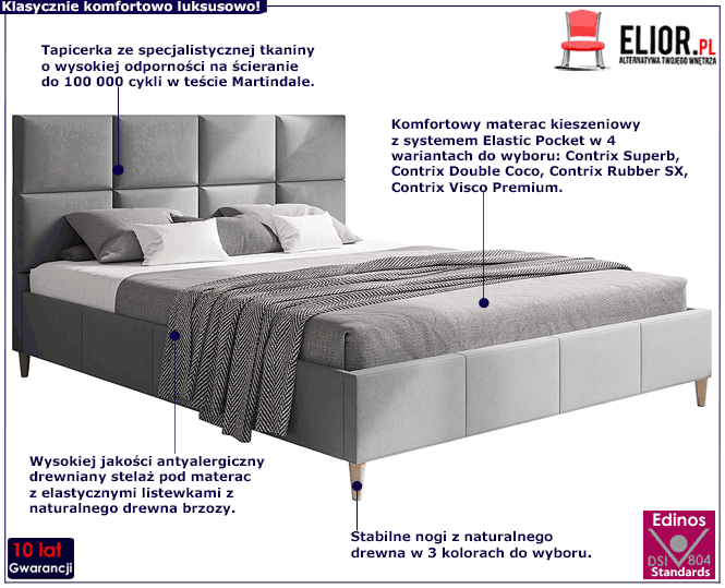 Odpowiednio dobrany, profesjonalny materac to podstawa pełnowartościowego wypoczynku i zdrowego snu. W trosce o potrzeby swoich klientów marka Edinos Premium zaprojektowała aż cztery komfortowe materace, dedykowane do tapicerowanego łóżka Moli. Wszystkie 4 modele zostały wyposażone w system kieszeni Elastic Pocket ze strefami o zróżnicowanej twardości zapewniającymi ergonomiczną pozycję ciała. Każda sprężyna znajduje się w osobnej otulinie z elastycznego materiału, który zapobiega przecieraniu się i pękaniu kieszonek, eliminując przy tym efekt wyginania się kieszeni i dodatkowo zwiększając wytrzymałość. Sprężyny zostały wykonane w najnowocześniejszej technologii CONTROLHARD, wykorzystującej podwójne hartowanie drutu węglowego, które zapewnia ponad 50% wydłużoną żywotność. Dodatkowo każdy materac został wyposażony w pikowany pokrowiec antyalergiczny o wydłużonym cyklu ścieralności z wszytym zamkiem, który dzięki możliwości zdjęcia i wyprania pozwala zachować świeżość i najwyższy poziom higieny.