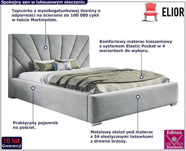 - Ergonomiczna konstrukcja - brak wystającej drewnianej, czy metalowej ramy powoduje, że nie ma ostrych kantów, o które można się uderzyć, jest miękko i bezpiecznie. Tak skonstruowane łóżko nie skrzypi, dzięki czemu nie będziesz się wybudzać przy każdej zmianie pozycji ciała.