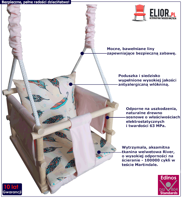 Huśtawka Vertez prezentuje się niezwykle elegancko dzięki przyjemnej w dotyku, szlachetnej tkaninie welwetowej. Nie tylko wspaniale wygląda, ale jest też odporna na ścieranie - do 100000 cykli w teście Martindale. Konstrukcję huśtawki stanowi mocne, odporne na uszkodzenia drewno sosnowe o twardości aż 63 MPa w pomiarach metodą Janki. Niezwykle istotnym jest fakt, że posiada właściwości elektrostatyczne i reguluje poziom wilgotności powietrza. Całość utrzymują solidne, bawełniane liny, a wnętrze poduszki i siedziska wypełnione jest antyalergiczną, wysokogatunkową włókniną. Dzięki wykorzystanym materiałom oraz precyzji wykonania możesz być pewien, że huśtawka jest w pełni bezpieczna dla Twojego maleństwa. Postaw więc na polską, najwyższą jakość!