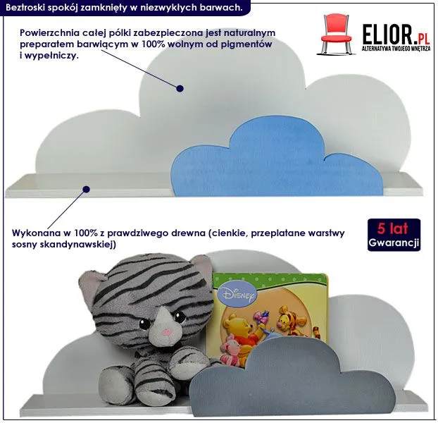 Prezentujemy Ci jakże efektowną wizualnie oraz bardzo praktyczną w użytkowaniu półkę wiszącą Cosmeo marki Elior. Mebel przeznaczony dla wnętrz dziecięcych dostępny jest w aż dziesięciu modnych barwach do wyboru. Półka Cosmeo wykonana została w całości z naturalnego drewna i nie zawiera żadnych szkodliwych substancji. Uważaj na podobne produkty konkurencji, produkowane z klejonych płyt wiórowych i drewnopodobnych. Materiały te mogą zawierać substancję, które nie są obojętne dla kontaktu z Twoim Dzieckiem!