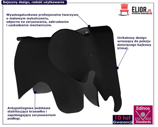 Znakomite krzesełko dziecięce Pawola to bez wątpienia designerska atrakcja wnętrza dziecięcego. Zabawna forma w kształcie sympatycznego słonia skradnie serca nie tylko najmłodszych miłośników dobrego designu, ale także dorosłych. Uniwersalna, nowoczesna forma przypominająca nieco wycinanakę z kartonu oraz przyjemna kolorystyka powoduje, że krzesełko świetnie się sprawdzi zarówno w pokoju chłopca jak i dziewczynki. Siedzisko mebla zostało tak wyprofilowane, by użytkowanie krzesłka było naprawdę wygodne i swobodne. Podstawa oraz całość mebla cechuje się ponadprzeciętną stabilnością, co jest gwarantuje idealny komfort i bezpieczeństwo podczas jego użytkowania. Ponadto antypoślizgowe wykończenie podstawy zabezpiecza podłogę przed zarysowaniem. Pełne bajkowego uroku krzesło Pawola bez wątpienia będzie stanowić designerską ozdobę dziecięcego pokoju. Pawola - pierwszy stylowy mebel Twojego dziecka!