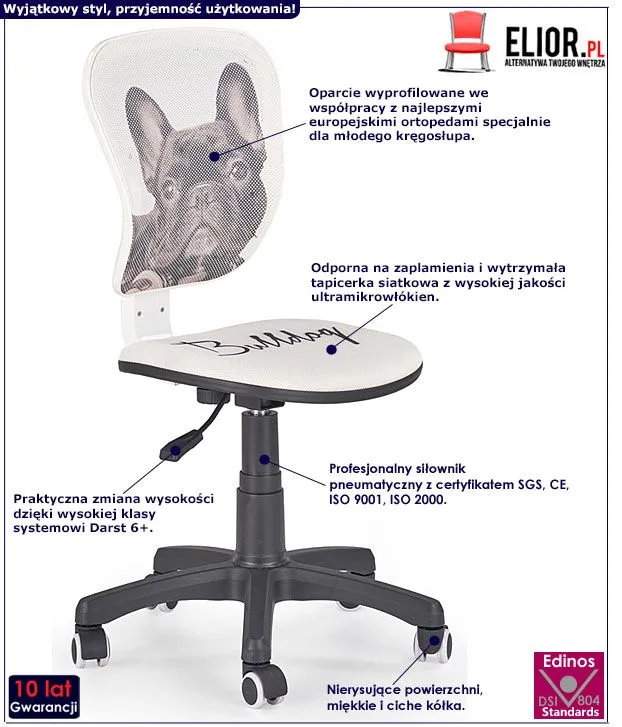 Efektowny wizualnie i komfortowy w użytkowaniu fotel obrotowy Luxor wyróżnia się nie tylko swoją unikalną formą, ale także zastosowaniem materiałów najlepszej jakości. Designerska tapicerka mebla z wzorem buldoga pokryta została wysokiej jakości tkaniną membranową oraz siatką wykonaną ze szlachetnych ultramikrowłókien. Materiał ten cechuje się ponadprzeciętną odpornością na zabrudzenia i wilgoć, co jest szczególnie ważne w przypadku artykułów przeznaczonych dla dzieci i młodzieży. Mikrosiatka pozwala także na oddychanie skóry oraz zapobiega nadmiernemu przegrzewaniu się ciała, dzięki czemu dziecko może bez problemu siedzieć na krześle nawet przez dłuższy okres czasu.  Ergonomicznie profilowane we współpracy z europejskimi ortopedami siedzisko oraz oparcie zapewniają malcowi wysoki komfort użytkowania. Łatwą i precyzyjną zmianę wysokości siedziska gwarantuje unikalny system Darst 6+. Dwa niebanalne wzory sprawią radość zarówno małym miłośnikom zwierzaków, jak i zagranicznych podróży. Nie musisz ryzykować nabycia wad postawy u Twoich najbliższych spowodowanych użytkowaniem tanich, niewygodnych krzeseł. Możesz zadbać o zdrowie rodziny inwestując w wysokiej jakości krzesło obrotowe Luxor marki Elior.