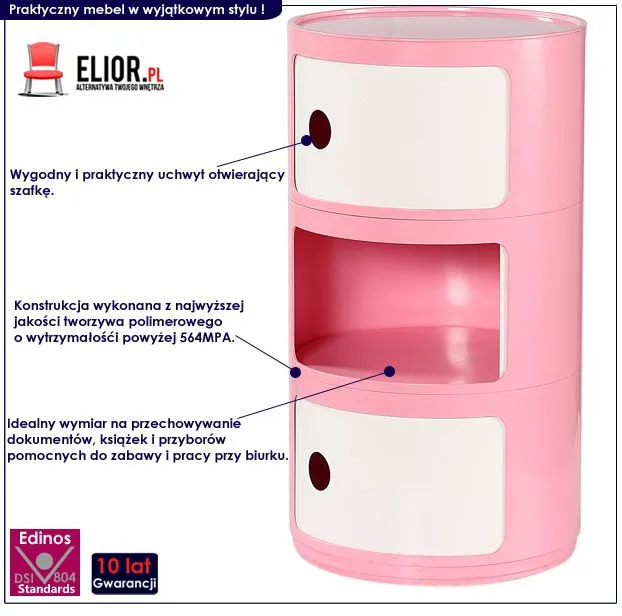 Szafka marki Elior wykonana została z najwyższej jakości tworzywa polimerowego o wytrzymałości powyżej 564MPA. Materiał ten jest całkowicie neutralny dla skóry i przeciwieństwie do tanich, chińskich produktów, posiada obojętny stosunek przy kontakcie także dla alergików. Mocne, kreatywne kolory regału sprawią, że świetnie dopasujesz je do pomieszczeń Twoich domowników (pokoje dziecięce, młodzieżowe). Kontenerek idealnie pasuje także do różnych biurek dostępnych na innych naszych ofertach. Stwórz profesjonalny zestaw marki Elior i zapewnij sobie lub swoim bliskim idealne warunki to tworzenia i rozwijania Swoich pasji. Szafka wyróżnia się nie tylko swoją praktyczną formą i ekstrawersyjnym kształtem, ale także zastosowaniem materiałów najlepszej jakości. To dlatego cieszy się powodzeniem wśród osób lubiących nowatorskie rozwiązania. Tylko jakość mebli marki Elior potwierdzona jest aż 10-letnią gwarancją ! Odmień Swoje wnętrze już dziś!
