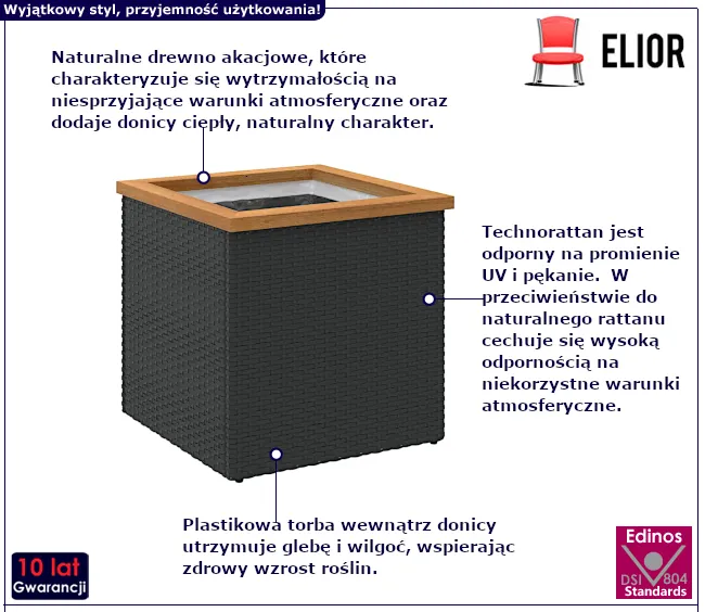 • Kolor: czarny oraz naturalne drewno akacjowe. W naszej ofercie posiadamy także inne donice ogrodowe.