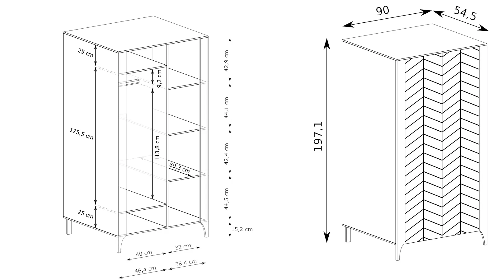• szerokość 90 cm, wysokość 197 cm, głębokość 54,5 cm