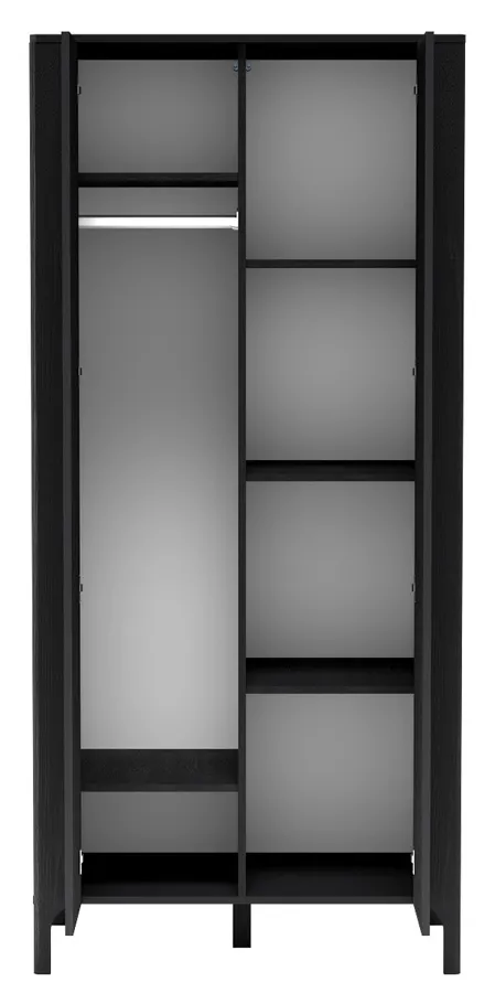 Szafa Sageri 9X to doskonały wybór dla osób szukających połączenia stylu z pojemnością. Jej geometryczny front w jodełkę stanowi mocny akcent estetyczny, a funkcjonalne wnętrze oferuje przestrzeń na ubrania wiszące, cztery pojemne półki oraz miejsce na buty i akcesoria. Dzięki uniwersalnym proporcjom i głębokiej czerni, szafa świetnie komponuje się zarówno w sypialni, jak i przedpokoju. To mebel, który łączy ponadczasowy wygląd z codzienną wygodą użytkowania.
