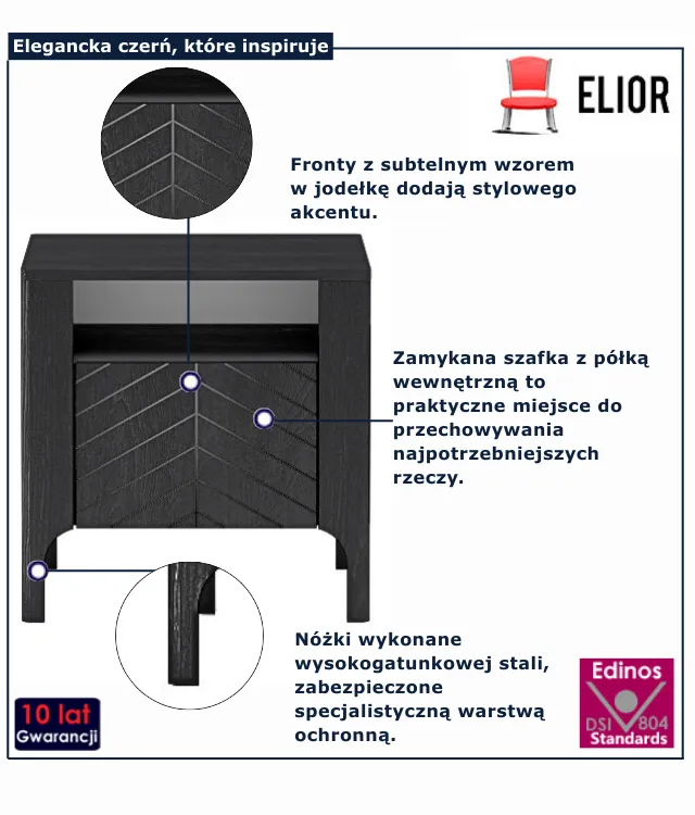 • Produkt posiada certyfikat jakości "Edinos Standards DSI 804", który potwierdza najwyższą jakość wykonania mebla oraz pełny stopień zgodności poszczególnych jednostek wytworzonego wyrobu z przyjętym wzorcem.