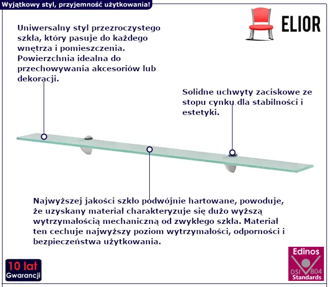 Półka Imker marki Elior wyróżnia się eleganckim designem z przezroczystego szkła, który wprowadza nowoczesny akcent do wnętrza. Wykonana z hartowanego szkła o grubości 8 mm, jest wyjątkowo trwała i bezpieczna w użytkowaniu, a solidne uchwyty ze stopu cynku zapewniają stabilność i łatwy montaż. Dzięki nośności 15 kg idealnie nadaje się do przechowywania akcesoriów i eksponowania dekoracji, pasując do każdego pomieszczenia w domu.