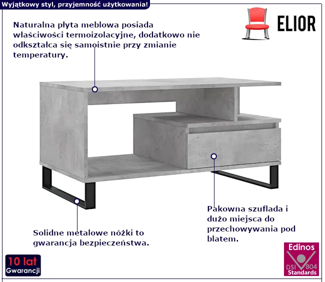 • Kolor: szarość betonu. W naszej ofercie posiadamy także inne stoliki kawowe do salonu.