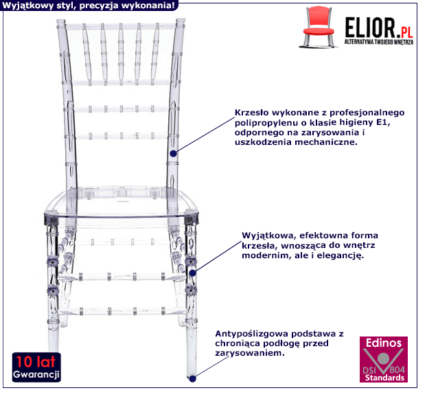 Szlachetny polipropylen zapewniający zarazem trwałość i lekkość transparentnego krzesła