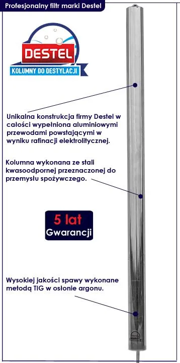 Filtry DESTEL wykonane są z dużą starannością i dokładnością, a wszystkie połączenia elementów kolumny zapewnią łatwe utrzymanie czystości. Filtr ma długość 110 cm i jest wykonany z rury o średnicy 50 mm. Kolumna wypełniona węglem aktywnym DESTEL skutecznie usuwa chlor i jego związki, a także inne zanieczyszczenia organiczne. Dzięki zastosowaniu filtra z węglem aktywnym DESTEL smak uzdatnionego destylatu poprawia się o 86%, znika też przykry zapach oraz żółte zabarwienie destylatu pochodzące ze związków organicznych.