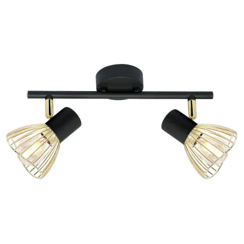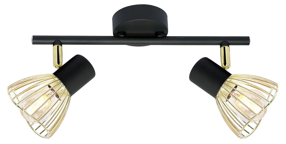 Nie zawiera głównego źródła światła Trzonek: E14 Moc max (W): 2x40 Materiał: klosz-koszyczek metalowy, podstawa metalowa Kolor: czarno złoty