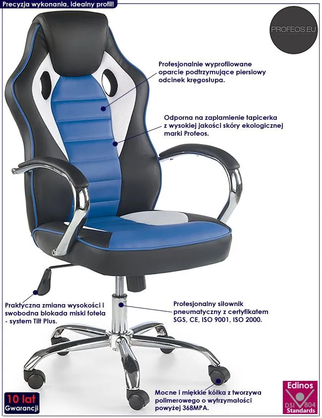 Designerska czarno-niebieska tapicerka fotela z białymi wstawkami pokryta została wysokiej jakości skórą ekologiczną marki Profeos. Ekoskóra używana przy produkcji mebli Profeos jest o wiele bardziej odporna na słońce oraz substancje płynne , co pozwala Ci na długie i bezpieczne użytkowanie. Już nie musisz się martwić, że rozlana kawa spowoduje konieczność wymiany mebla. Skóra ekologiczna marki Profeos została pokryta warstwą polichlorku winylu, dzięki czemu jest także odporna na działanie środków dezynfekujących na bazie rozpuszczalników - chemikalia te niszczą skórę naturalną. Komfortowo wyprofilowane przy wsparciu europejskich specjalistów z dziedziny ortopedii siedzisko, oparcie oraz podłokietniki zapewniają Ci wygodę nawet podczas dłuższego czasu spędzonego za biurkiem. Fotel Myst bez wątpienia zadowoli wszystkich wielbicieli nowoczesnej formy i oryginalnej stylistyki. Nie musisz ryzykować nabycia wad postawy spowodowanych użytkowaniem tanich, chińskich krzeseł. Zainwestuj w zdrowie Twoje i Twoich najbliższych kupując wysokiej jakości fotel marki Profeos.