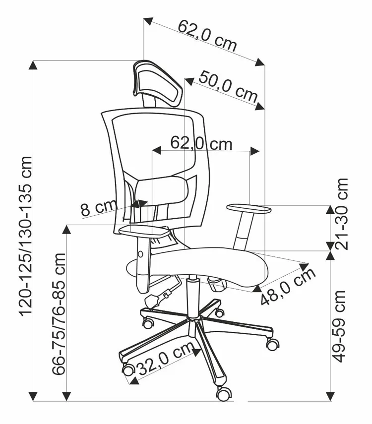 • Wymiary: szerokość: 68 cm, głębokość: 74 cm, wysokość: 122-128 cm, wysokość siedziska: 45-55 cm.