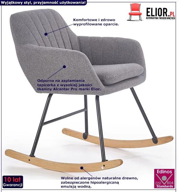 Komfortowy fotel na biegunach Hiras to idealny wybór nie tylko na zimowe wieczory przy kominku. Doskonale sprawdza się także jako mebel do czytania, oglądania telewizji czy krótkiej drzemki. Designerska tapicerka w kolorze popielatym wykonana została z wysokiej jakości tkaniny Alcantar Pro, charakteryzującej się dużą odpornością na ścieranie i zabrudzenie oraz niezwykłą miękkością w dotyku (dzięki warstwie poliuretanu). Tkanina Alcantar Pro, która jako jedyna na rynku produkowana jest z dokładnie wyselekcjonowanych ultramikrowłókien o objętości aż do 24-razy drobniejszej od ludzkiego włosa, charakteryzuje się wyjątkową żywotnością, odpornością oraz niezwykłą łatwością w utrzymaniu. Posiada ponadprzeciętne cechy wytrzymałościowe, dzięki czemu unikniesz co sezonowej wymiany tapicerki. Tkanina Alcantar jest także bardzo praktyczna i można ją czyścić na mokro, co jest szczególnie istotne w przypadku mebli wykorzystywanych podczas posiłków. Profil mebla stworzony jest z najwyższej jakości nierdzewnej stali malowanej odpornym na zarysowania i zadrapania. Najwyższa jakość techniki polimeryzacji pozwoliła zaoferować firmie Elior aż 10 lat gwarancji na swoje produkty. Już nie musisz się martwić, że po kilku latach część farby odpryśnie od mebla . Płozy wykonano z naturalnego drewna, wolnego od alergenów, a następnie zabezpieczonego hipoalergiczną emulsją wodną. Lite drewno wyróżnia się niezwykłą wytrzymałością i odpornością na uszkodzenia mechaniczne, co gwarantuje Ci długie i komfortowe użytkowanie. Fotel wypoczynkowy marki Elior doskonale nadaje się nie tylko do salonu czy sypialni, ale także do nowoczesnego biura czy pracowni. Gwarantuje także wielką radość i przyjemność użytkowania dzieciom czy młodzieży. Hiras sprawia, że chwile przerwy od ciężkiej pracy i codziennych obowiązków stają się niebywale wygodne i pełne relaksu. Daj się uwieść niesamowitemu designowi fotela Elior - zakochasz się w nim od pierwszego wejrzenia!