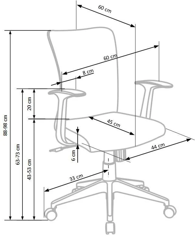 • Wymiary: wysokość całkowita: 88-98 cm, wysokość siedziska: 43-53 cm, głębokość mebla: 60 cm, głębokość siedziska: 45 cm, szerokość mebla: 60 cm, szerokość siedziska: 44 cm.