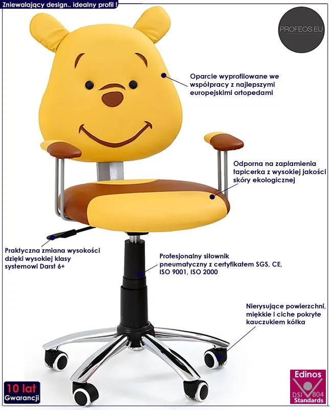 Komfortowy i efektowny wizualnie fotel do biurka Westa wyróżnia się nie tylko swoją unikalną formą, ale także zastosowaniem materiałów najlepszej jakości. Designerska tapicerka krzesła wykonana została z najwyższej jakości ekoskóry (skóry ekologicznej), łatwej do utrzymania w czystości. Ekoskóra używana przy produkcji mebli marki Profeos jest o wiele bardziej odporna na słońce oraz wodę , co pozwala Ci na długie i bezpieczne użytkowanie. Już nie musisz się martwić, że rozlany napój spowoduje konieczność wymiany mebla. Skóra ekologiczna marki Profeos została pokryta warstwą polichlorku winylu. Ergonomicznie profilowane siedzisko oraz oparcie zapewniają dziecku komfort pracy nawet przez dłuższy czas. Łatwą i precyzyjną zmianę wysokości siedziska gwarantuje unikalny system Darst 6+. Kółka powlekane są wysokiej jakości kauczukiem, dzięki czemu nie rysują powierzchni (drewno, panele, parkiet itp.). Nie musisz ryzykować nabycia wad postawy spowodowanych użytkowaniem tanich, chińskich krzeseł. Możesz zadbać o zdrowie Twoich najbliższych inwestując w wysokiej jakości fotel marki Profeos.