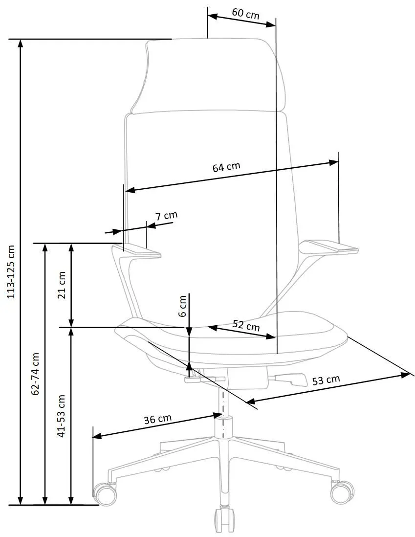 - Wymiary: szerokość mebla: 60 cm, wysokość całkowita mebla: 113-125 cm, wysokość siedziska mebla: 41 – 53 cm, głębokość mebla: 64 cm.