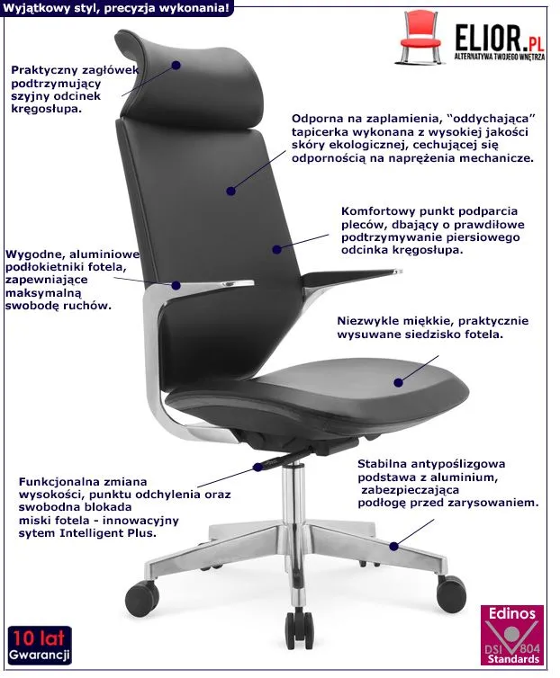 - Produkt posiada certyfikat jakości "Edinos Standards DSI 804", który potwierdza najwyższą jakość wykonania mebla oraz pełny stopień zgodności poszczególnych jednostek wytworzonego wyrobu z przyjętym wzorcem.