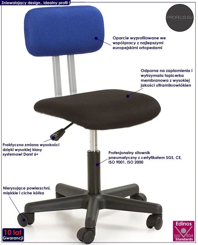 Komfortowy i praktyczny w użytkowaniu fotel do komputera Ledis wyróżnia się nie tylko swoją unikalną formą, ale także zastosowaniem materiałów najlepszej jakości. Tapicerka mebla pokryta została wysokiej jakości tkaniną membranową wykonaną ze szlachetnych ultramikrowłókien. Materiał ten cechuje się ponadprzeciętną odpornością na zabrudzenia i wilgoć, co jest szczególnie ważne w przypadku artykułów dla dzieci i młodzieży. Ergonomicznie profilowane siedzisko oraz oparcie zapewniają dziecku komfort pracy nawet przez dłuższy czas. Łatwą i precyzyjną zmianę wysokości siedziska gwarantuje unikalny system Darst 6+. Nie musisz ryzykować nabycia wad postawy spowodowanych użytkowaniem tanich, chińskich krzeseł. Możesz zadbać o zdrowie Twoich najbliższych inwestując w wysokiej jakości fotel marki Profeos.