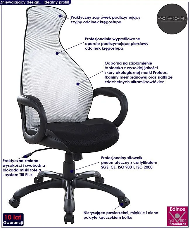 Designerska tapicerka fotela pokryta została wysokiej jakości skórą ekologiczną marki Profeos, tkaniną membranową oraz siatką wykonaną ze szlachetnych ultramikrowłókien. Ekoskóra używana przy produkcji mebli Profeos jest o wiele bardziej odporna na słońce oraz wodę , co pozwala Ci na długie i bezpieczne użytkowanie. Już nie musisz się martwić, że rozlana kawa spowoduje konieczność wymiany mebla. Skóra ekologiczna marki Profeos została pokryta warstwą polichlorku winylu. Mikrosiatka Profeos pozwala na oddychanie skóry oraz zapobiega nadmiernemu przegrzewaniu się ciała. Fotel ten bez wątpienia zadowoli wszystkich wielbicieli wygody i wysmakowanego designu. Nie musisz ryzykować nabycia wad postawy spowodowanych użytkowaniem tanich, chińskich krzeseł. Zainwestuj w zdrowie Twoje i Twoich najbliższych kupując wysokiej jakości fotel marki Profeos.
