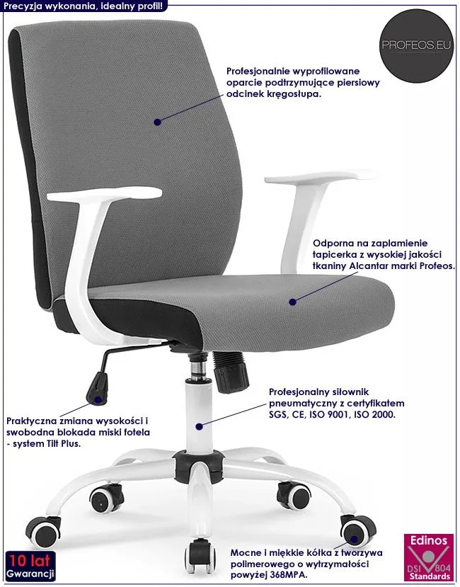 Twoja praca przy biurku może zostać dużo bardziej przyjemna, komfortowa i efektywna! Jeżeli pragniesz aby siedzenie przy biurku było przyjemnością dla Twojego kręgosłupa, sprawdź prezentację profesjonalnego fotela obrotowego Lunaro marki Profeos. Krzesło biurowe wyposażone jest w unikalny mechanizm Tilt Plus, który umożliwia Ci dokładną blokadę oparcia siedziska w pozycji pionowej lub swobodne bujanie się (idealne rozwiązanie na przerwę w pracy oraz relaks). To niezwykle wygodna i bardzo zdrowa metoda, gdyż przechylenie się do tyłu zapewnia optymalne krążenie krwi i zwalnia napięcie w Twoich udach! Chcesz dowiedzieć się o innych zaletach tego fascynującego i efektownego mebla? Zapraszamy do zapoznania się z poniższym opisem!
