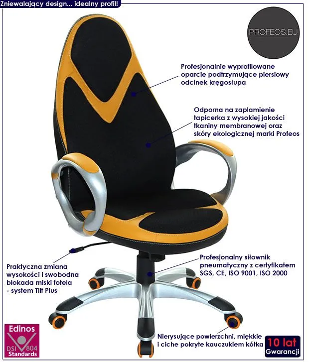 Tapicerka fotela pokryta została wysokiej jakości tkaniną membranową oraz skórą ekologiczną marki Profeos. Tkanina membranowa wykonana ze szlachetnych ultramikrowłokien to materiał charakteryzujący się ponadprzeciętną odpornością na zabrudzenia. Mikrosiatka pozwala także na oddychanie skóry oraz zapobiega nadmiernemu przegrzewaniu się ciała. Ekoskóra używana przy produkcji mebli Profeos jest o wiele bardziej odporna na słońce oraz wodę , co pozwala Ci na długie i bezpieczne użytkowanie. Już nie musisz się martwić, że rozlana kawa spowoduje konieczność wymiany mebla. Skóra ekologiczna marki Profeos została pokryta warstwą polichlorku winylu. Komfortowo wyprofilowane przy wsparciu europejskich specjalistów z dziedziny ortopedii siedzisko oraz oparcie zapewniają Ci wygodę nawet podczas dłuższego czasu spędzonego za biurkiem. Fotel ten doskonale sprawdza się zarówno w nowocześnie jak i tradycyjnie urządzonych pracowniach, biurach czy innych pomieszczeniach. Nie musisz ryzykować nabycia wad postawy spowodowanych użytkowaniem tanich, chińskich krzeseł. Zainwestuj w zdrowie Twoje i Twoich najbliższych kupując wysokiej jakości fotel marki Profeos.
