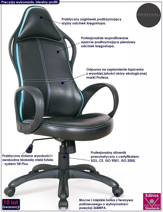 Designerska tapicerka fotela pokryta została wysokiej jakości skórą ekologiczną marki Profeos. Ekoskóra używana przy produkcji mebli Profeos jest o wiele bardziej odporna na słońce oraz substancje płynne , co pozwala Ci na długie i bezpieczne użytkowanie. Już nie musisz się martwić, że rozlana kawa spowoduje konieczność wymiany mebla. Skóra ekologiczna marki Profeos została pokryta warstwą polichlorku winylu. Krzesło obrotowe Uzet w dwóch modnych wersjach kolorystycznych do wyboru bez wątpienia zadowoli wszystkich wielbicieli wygody i innowacyjnego designu. Nie musisz ryzykować nabycia wad postawy spowodowanych użytkowaniem tanich, chińskich krzeseł. Zainwestuj w zdrowie Twoje i Twoich najbliższych kupując wysokiej jakości fotel marki Profeos.