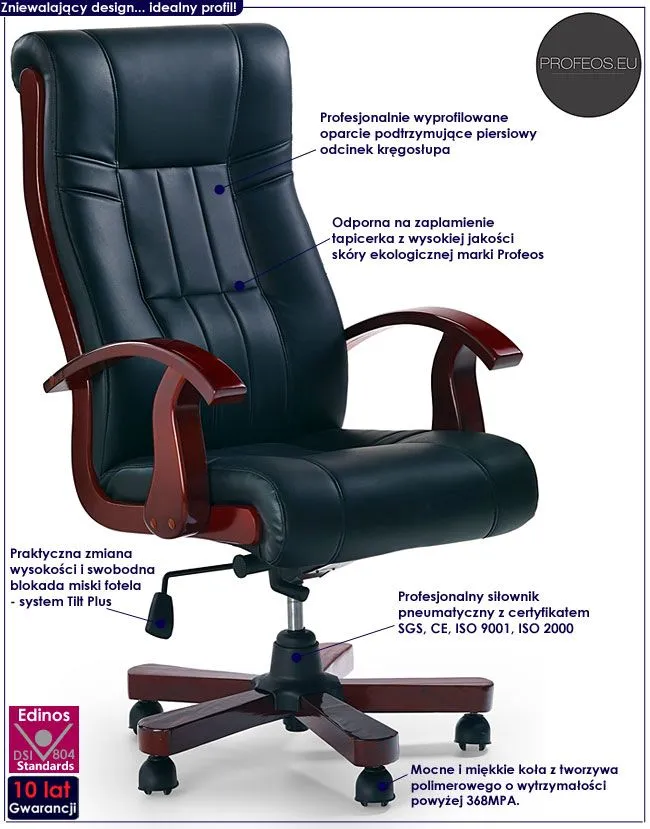 Designerska tapicerka fotela pokryta została wysokiej jakości skórą ekologiczną marki Profeos. Ekoskóra używana przy produkcji mebli Profeos jest o wiele bardziej odporna na słońce oraz wodę , co pozwala Ci na długie i bezpieczne użytkowanie. Już nie musisz się martwić, że rozlana kawa spowoduje konieczność wymiany mebla. Skóra ekologiczna marki Profeos została pokryta warstwą polichlorku winylu. Komfortowo wyprofilowane przy wsparciu europejskich specjalistów z dziedziny ortopedii siedzisko, oparcie oraz podłokietniki zapewniają Ci wygodę nawet podczas dłuższego czasu spędzonego za biurkiem. Fotel ten bez wątpienia zadowoli wszystkich wielbicieli nowoczesnej formy i oryginalnej stylistyki. Nie musisz ryzykować nabycia wad postawy spowodowanych użytkowaniem tanich, chińskich krzeseł. Zainwestuj w zdrowie Twoje i Twoich najbliższych kupując wysokiej jakości fotel marki Profeos.